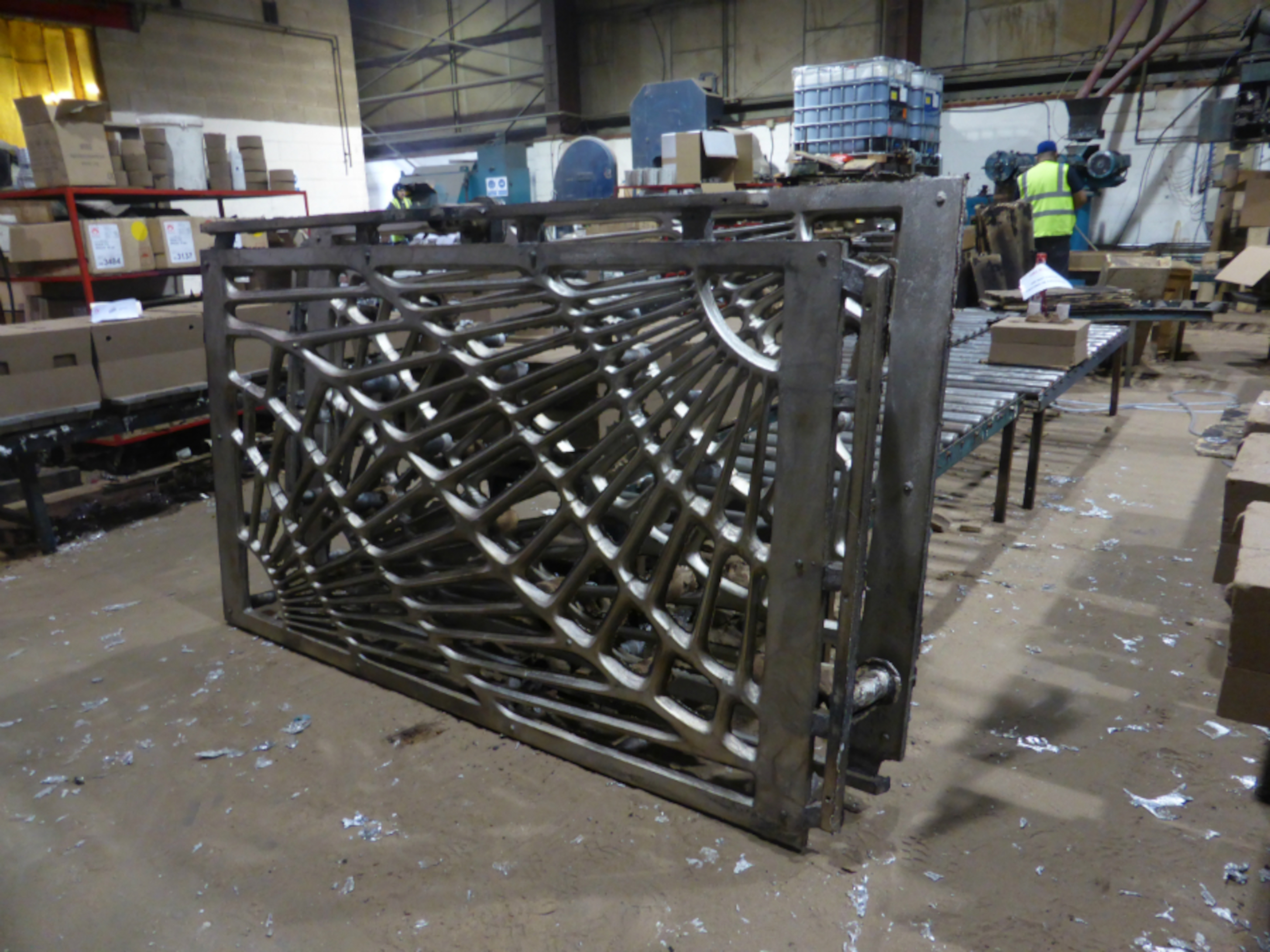 Above, inspecting the assembly with the cast panels in place for rail bridge parapets at Deventry. At the same time I was making the wine coasters and ‘chased’ silver dishes shown further down. The cast iron beams immediately below are for the Art Workers Guild building in Queens Square in London installed 2017.