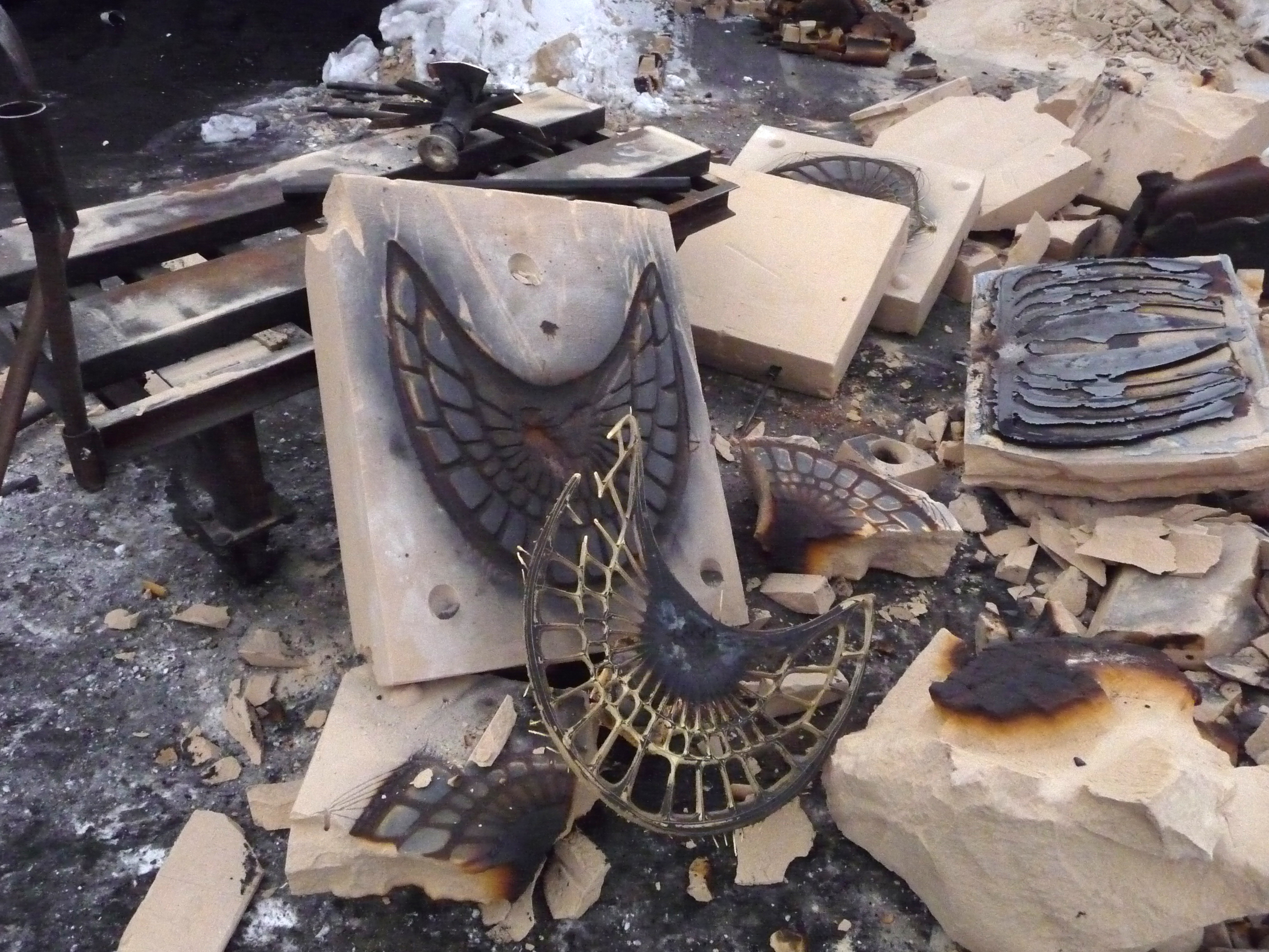 Above, breaking open sand moulds and below stacked aluminium sand castings.